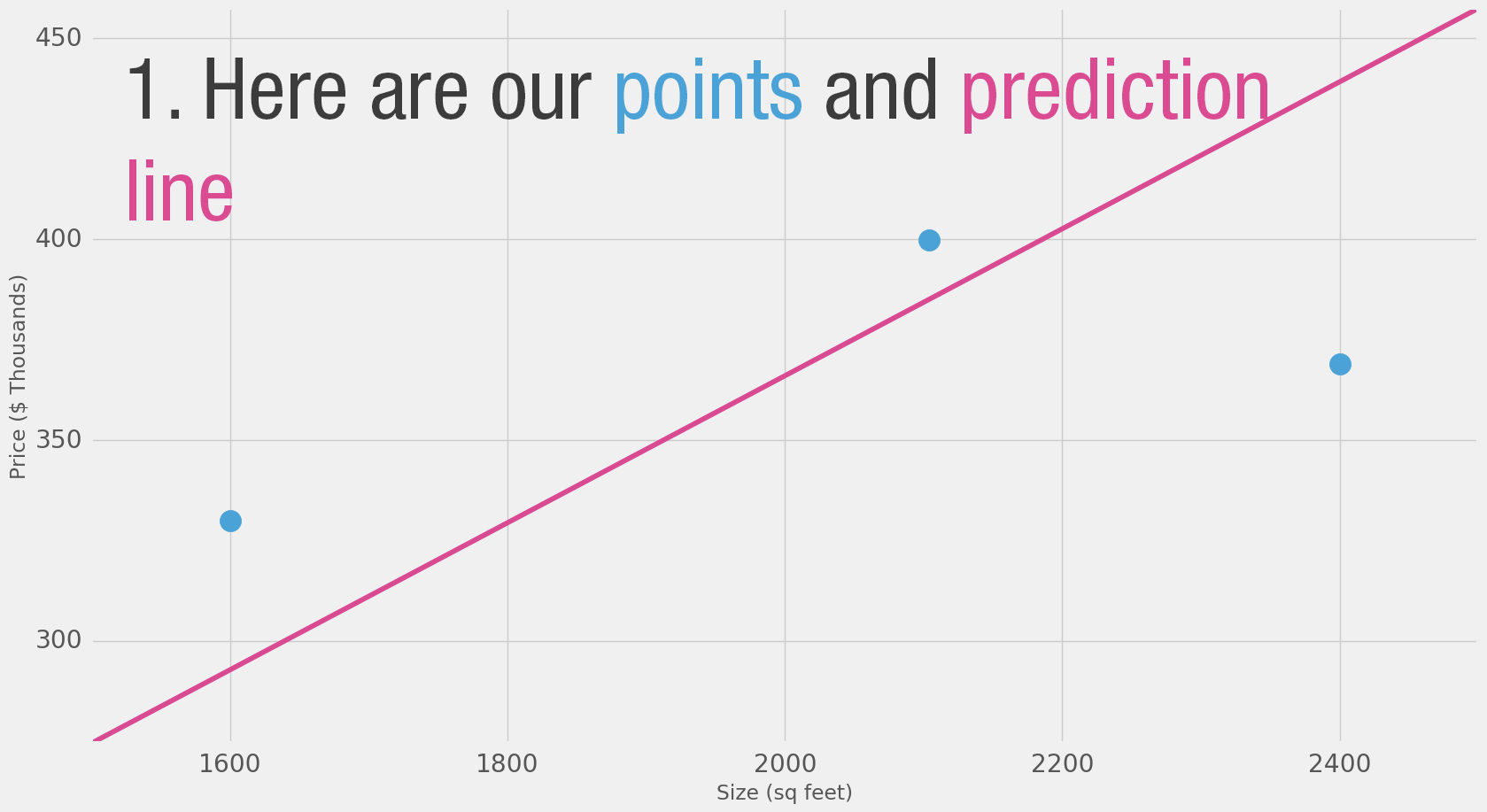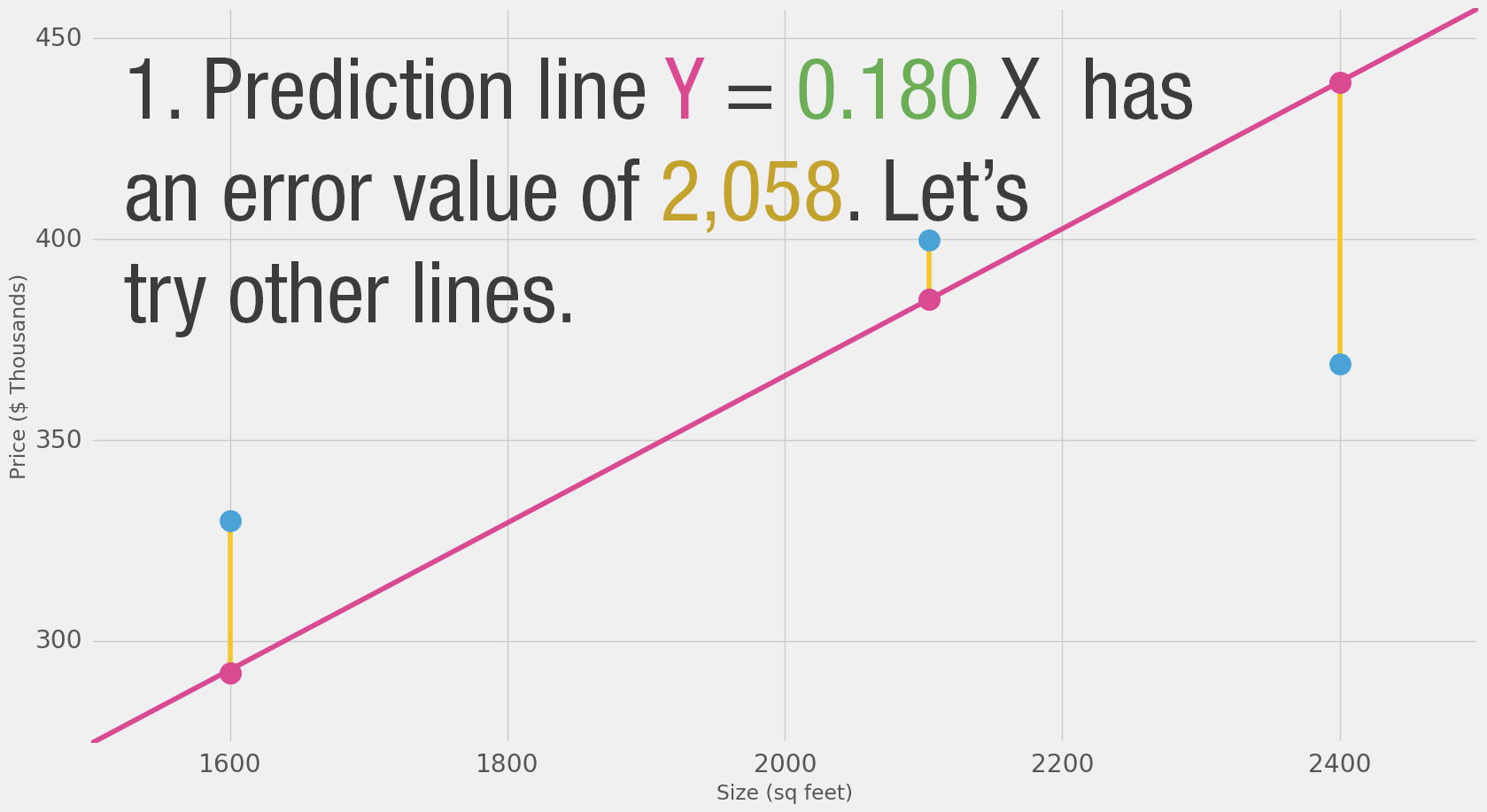 Can we do better than estimate the price based on the average of our data points? Let's try. Let's first define what it means to be better in this scenario. If we apply our model to the three data points we have, how good of a job would it do?